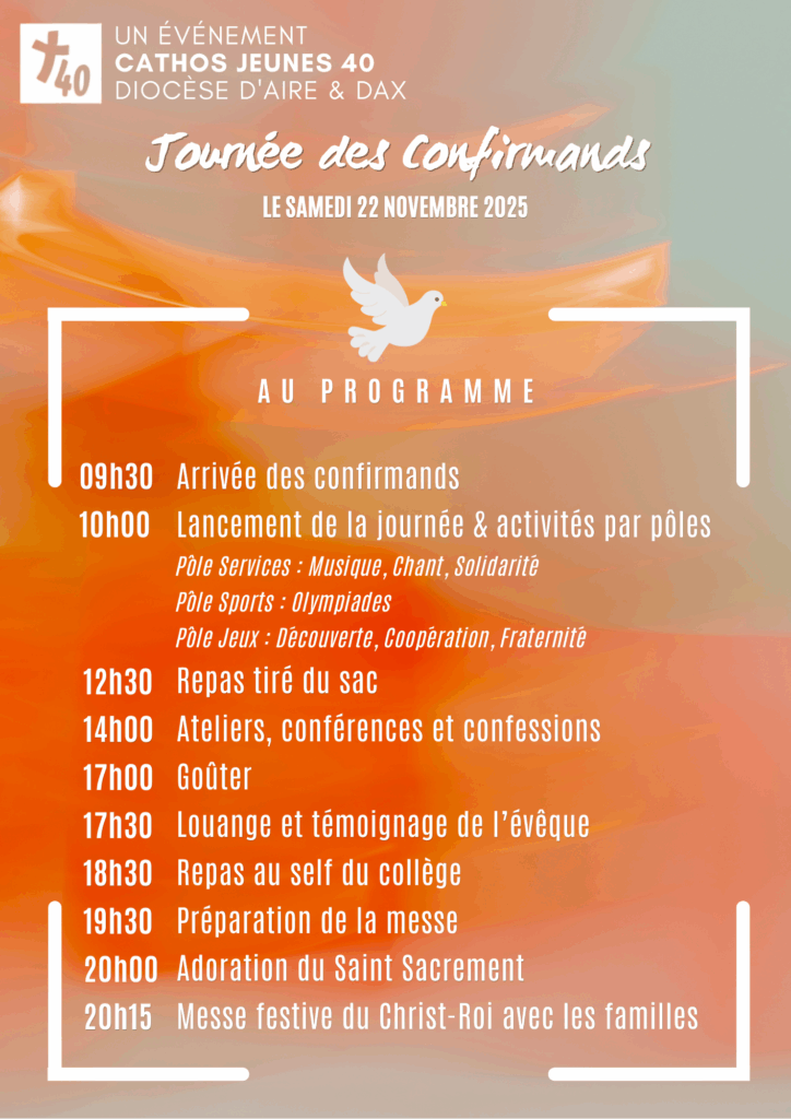 La Journée des Confirmands 2025 aura lieu le samedi 22 novembre 2025 au collège Jean Cassaigne à Mont-de-Marsan.