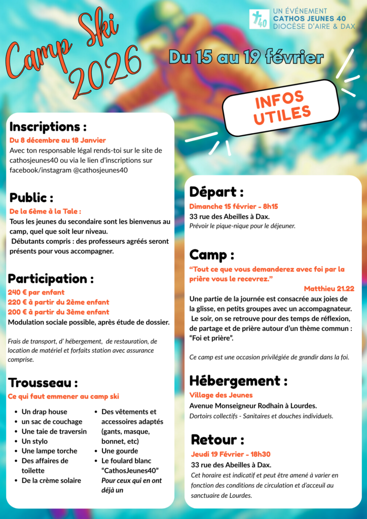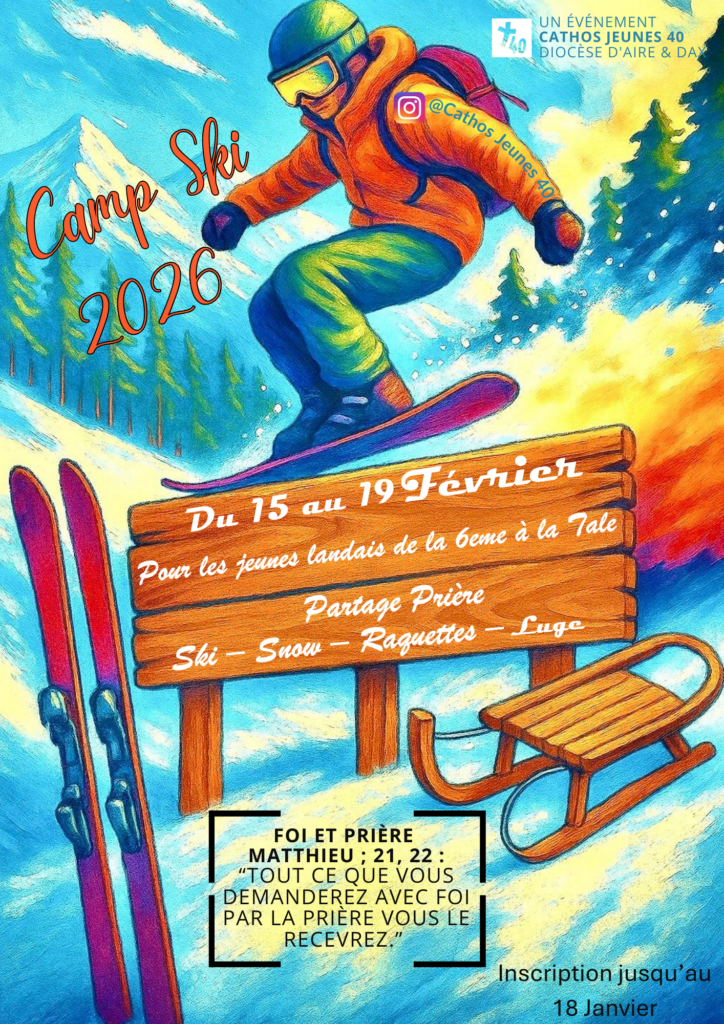 Chaque année, Cathos Jeunes 40 propose à une centaine de jeunes du diocèse, âgés entre 11 et 18 ans, de profiter de quelques jours de plaisirs enneigés en se rassemblant dans un cadre différent pour grandir en espérance et en intériorité. Avec une touche particulière cette année sur le thème de la Foi. Un évènement impactant qui permet aux jeunes de revenir transformés et heureux !