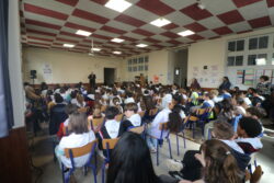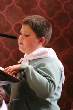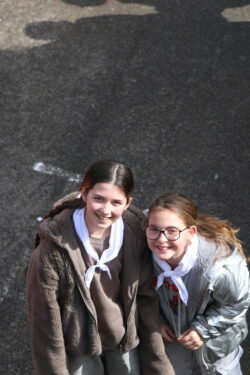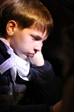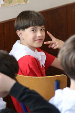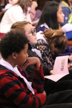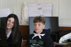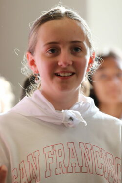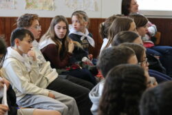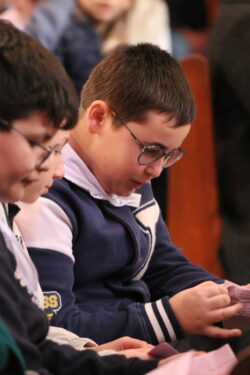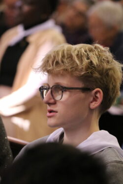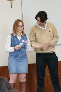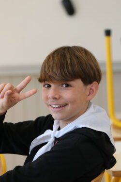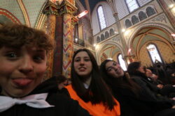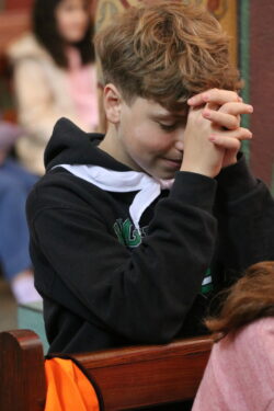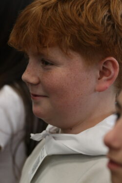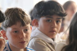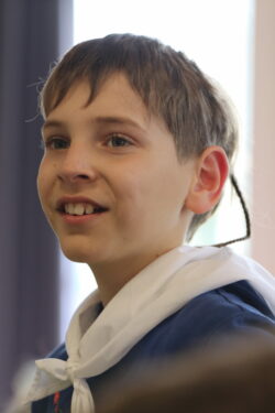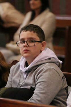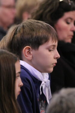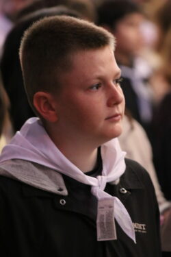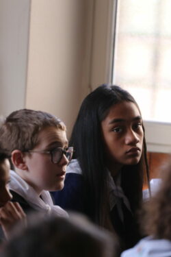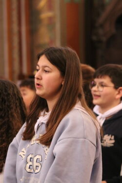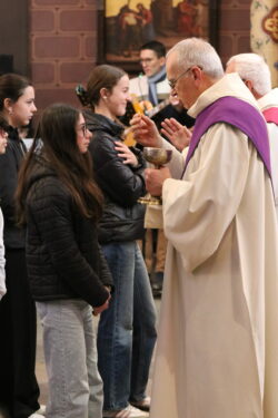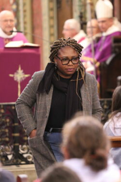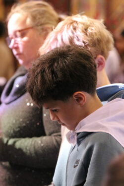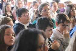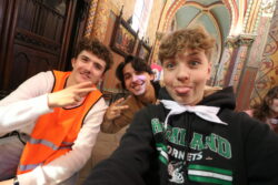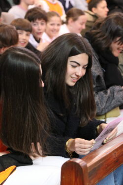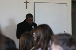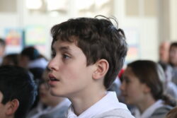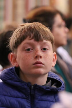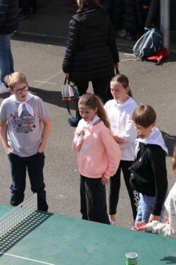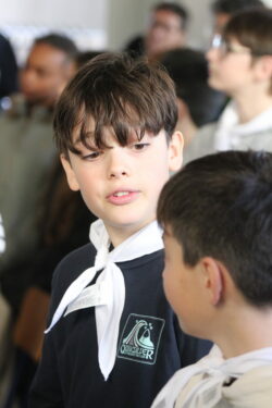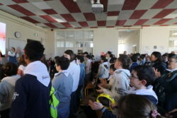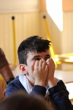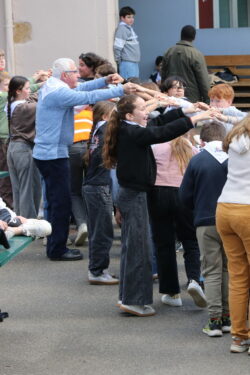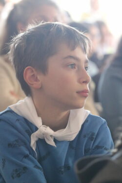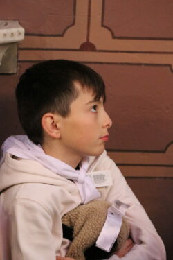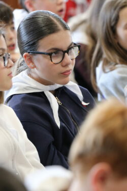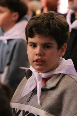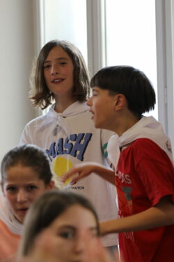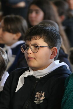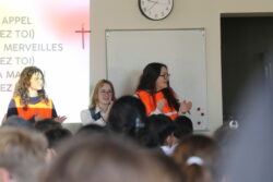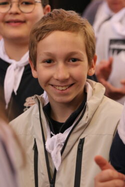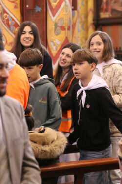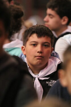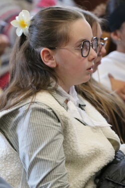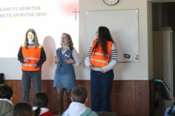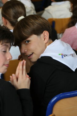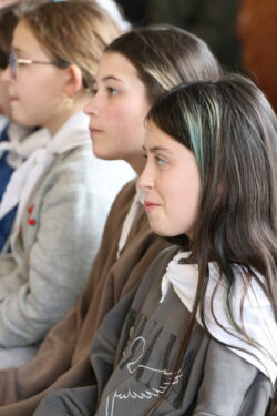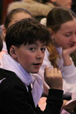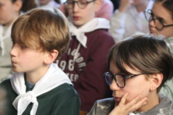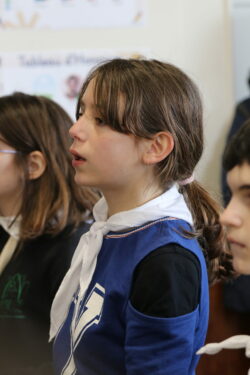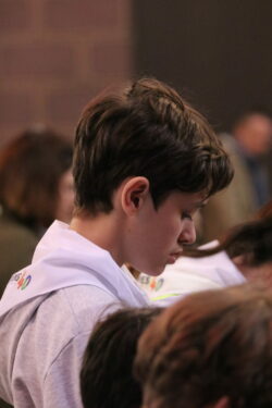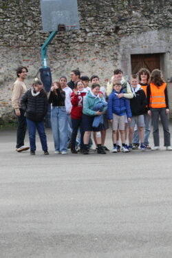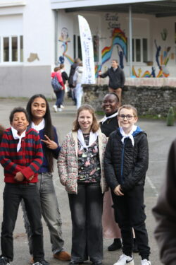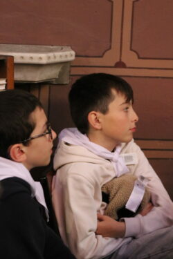 Mais toutes les bonnes choses ont une fin : nous sommes retournés en salle polyvalente pour chanter et danser avant de vivre un premier temps d’échange avec Monseigneur. Pendant 30 minutes, il a répondu à plusieurs questions sur le Credo : le Père, le Fils, le Saint-Esprit et l’Église. (Pour les questions restées sans réponse, un peu de patience : les réponses de Monseigneur Souchu seront prochainement publiées en vidéo sur notre site et nos réseaux sociaux.)