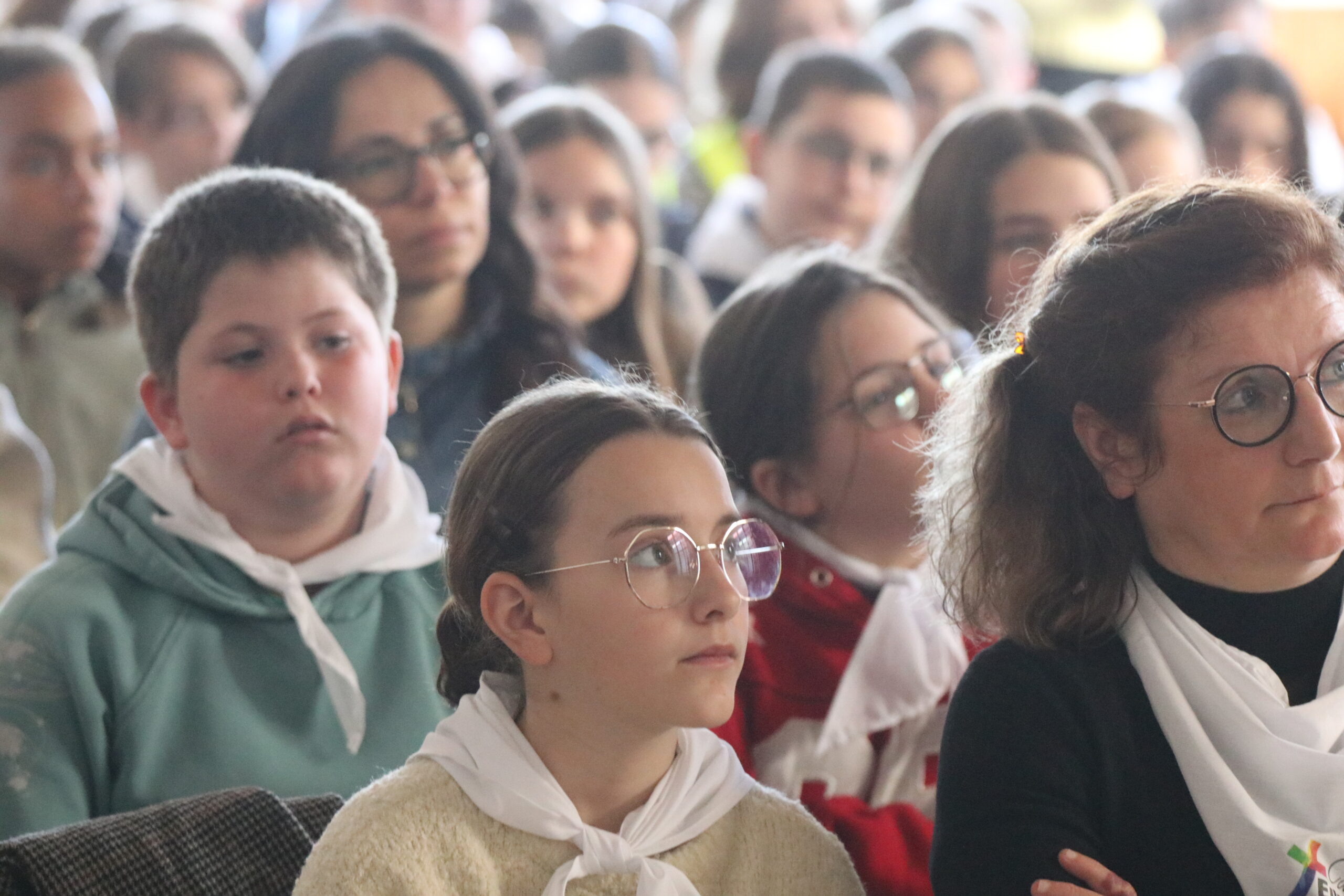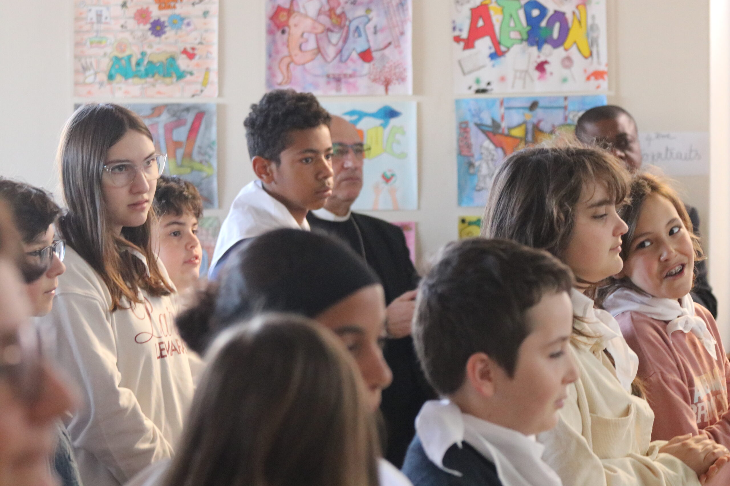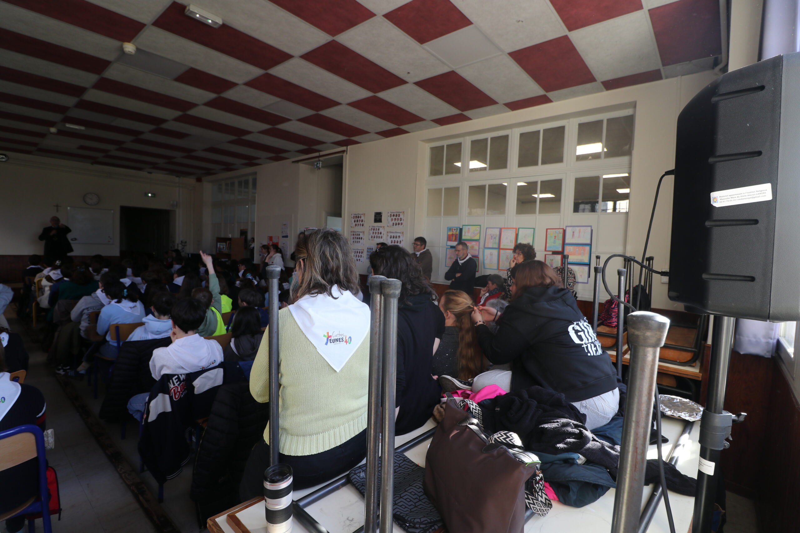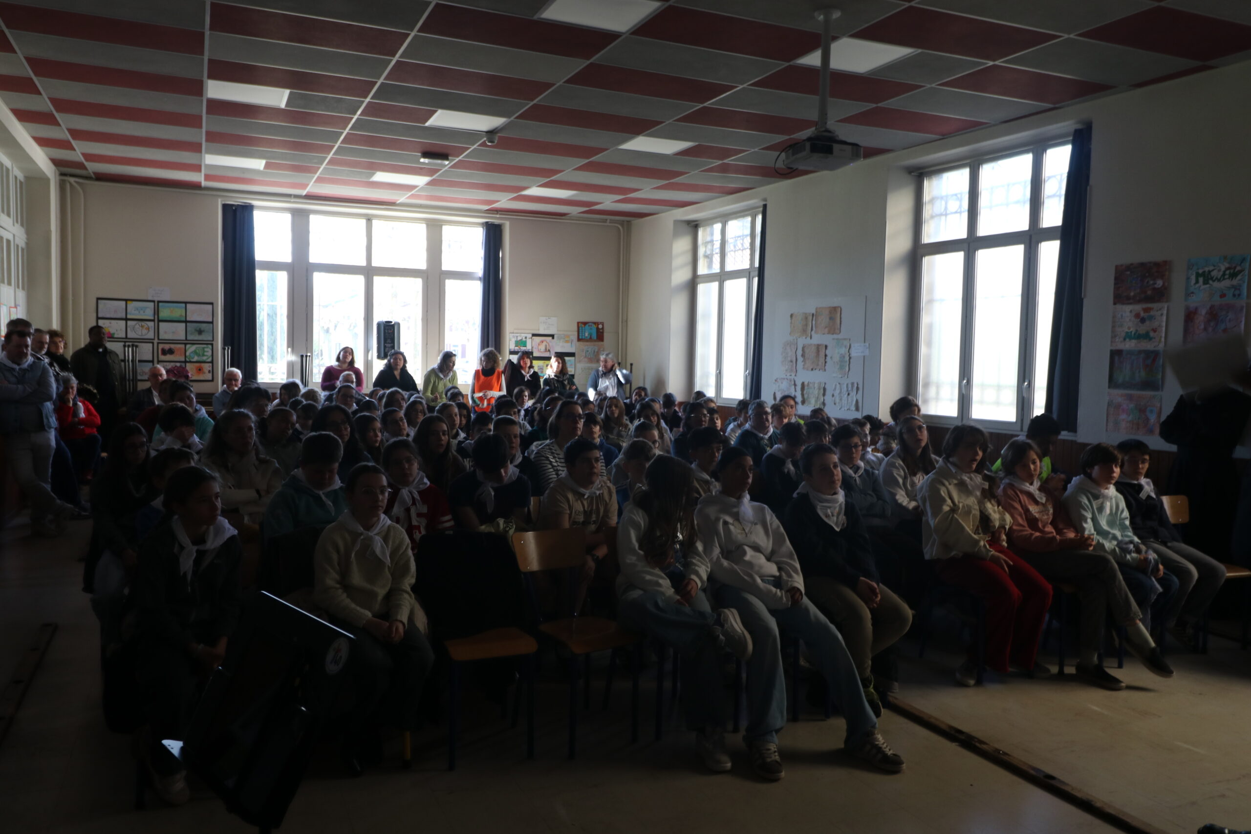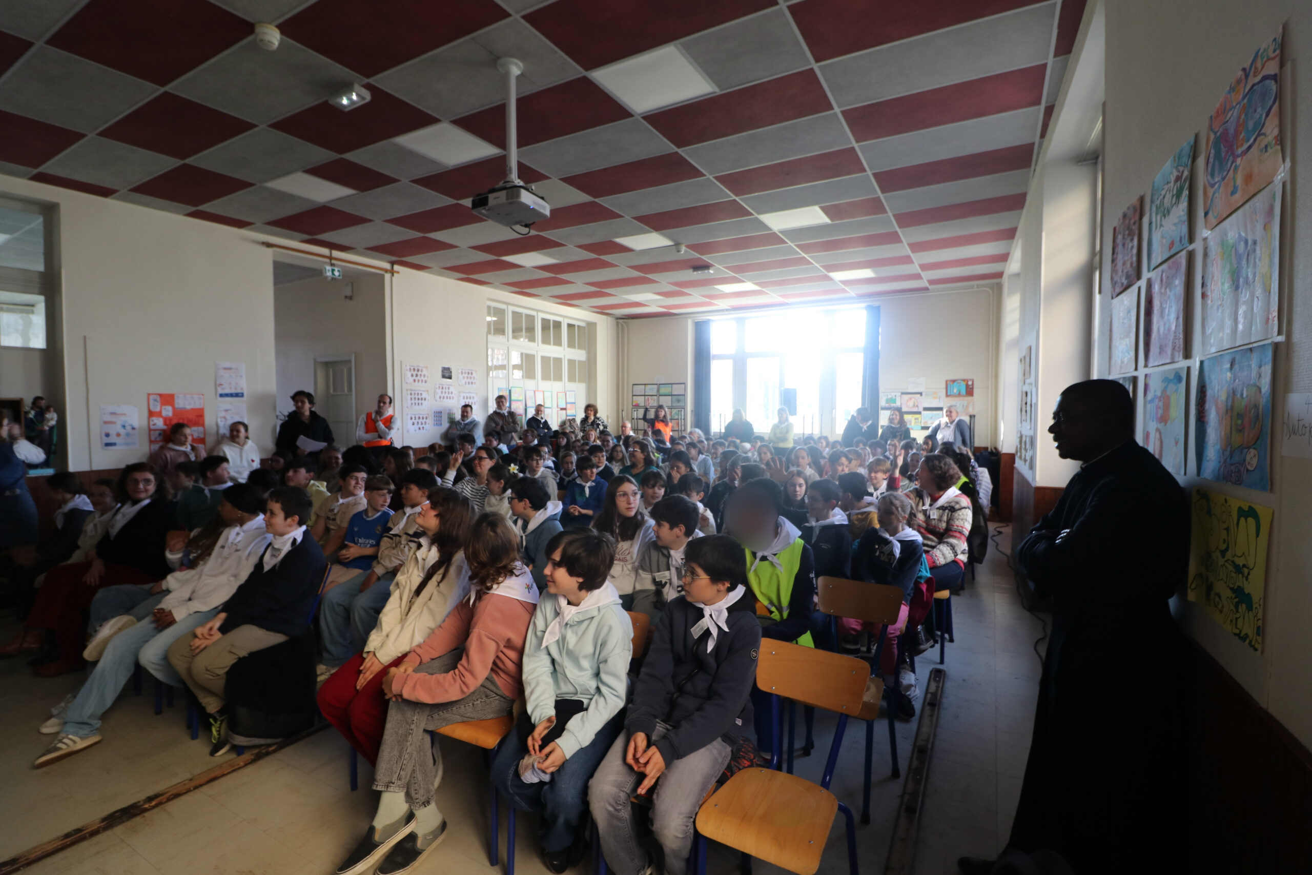 Mais toutes les bonnes choses ont une fin : nous sommes retournés en salle polyvalente pour chanter et danser avant de vivre un premier temps d’échange avec Monseigneur. Pendant 30 minutes, il a répondu à plusieurs questions sur le Credo : le Père, le Fils, le Saint-Esprit et l’Église. (Pour les questions restées sans réponse, un peu de patience : les réponses de Monseigneur Souchu seront prochainement publiées en vidéo sur notre site et nos réseaux sociaux.)
