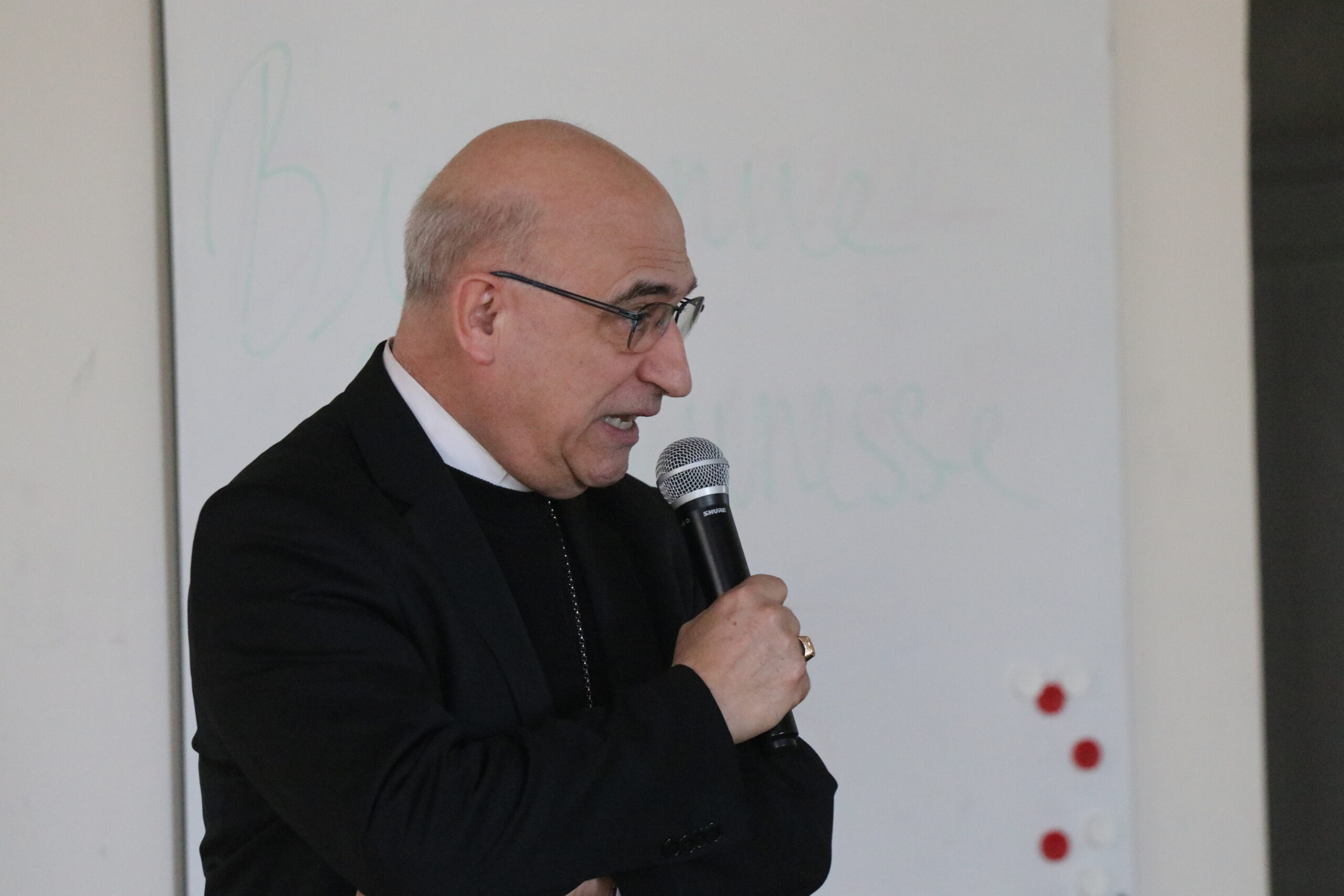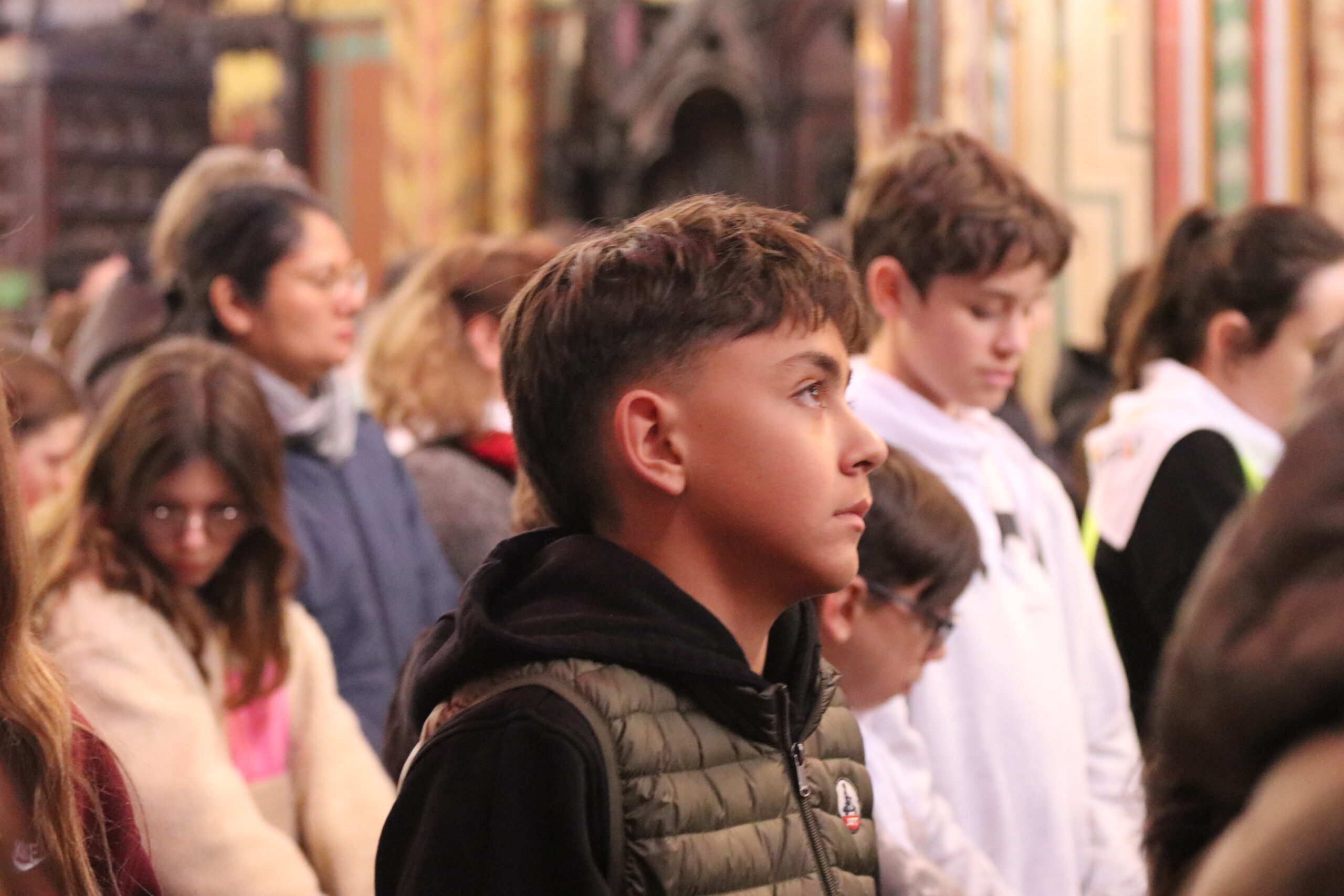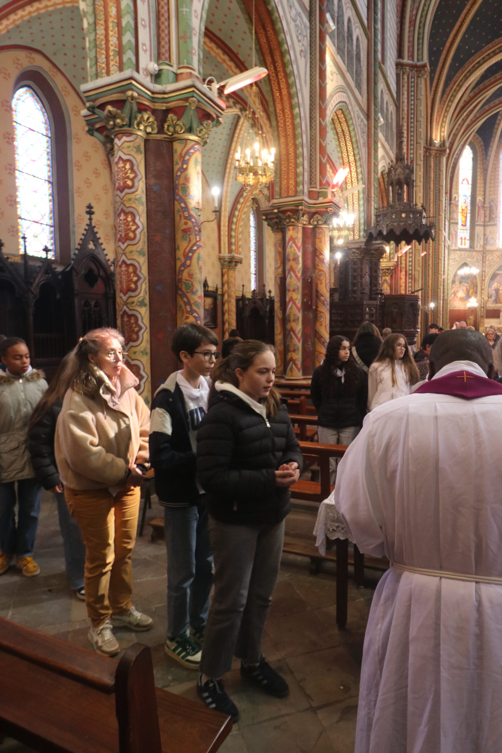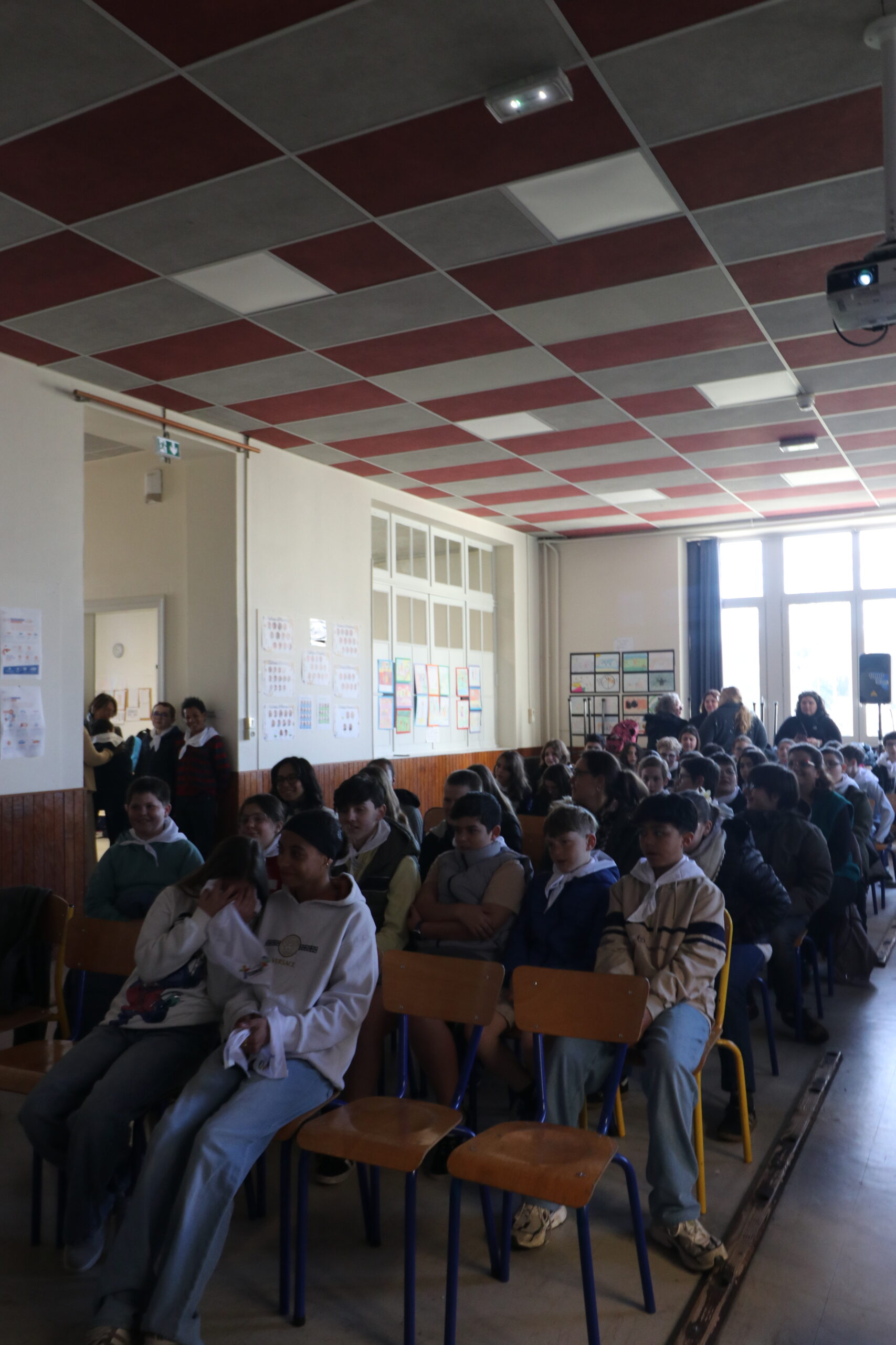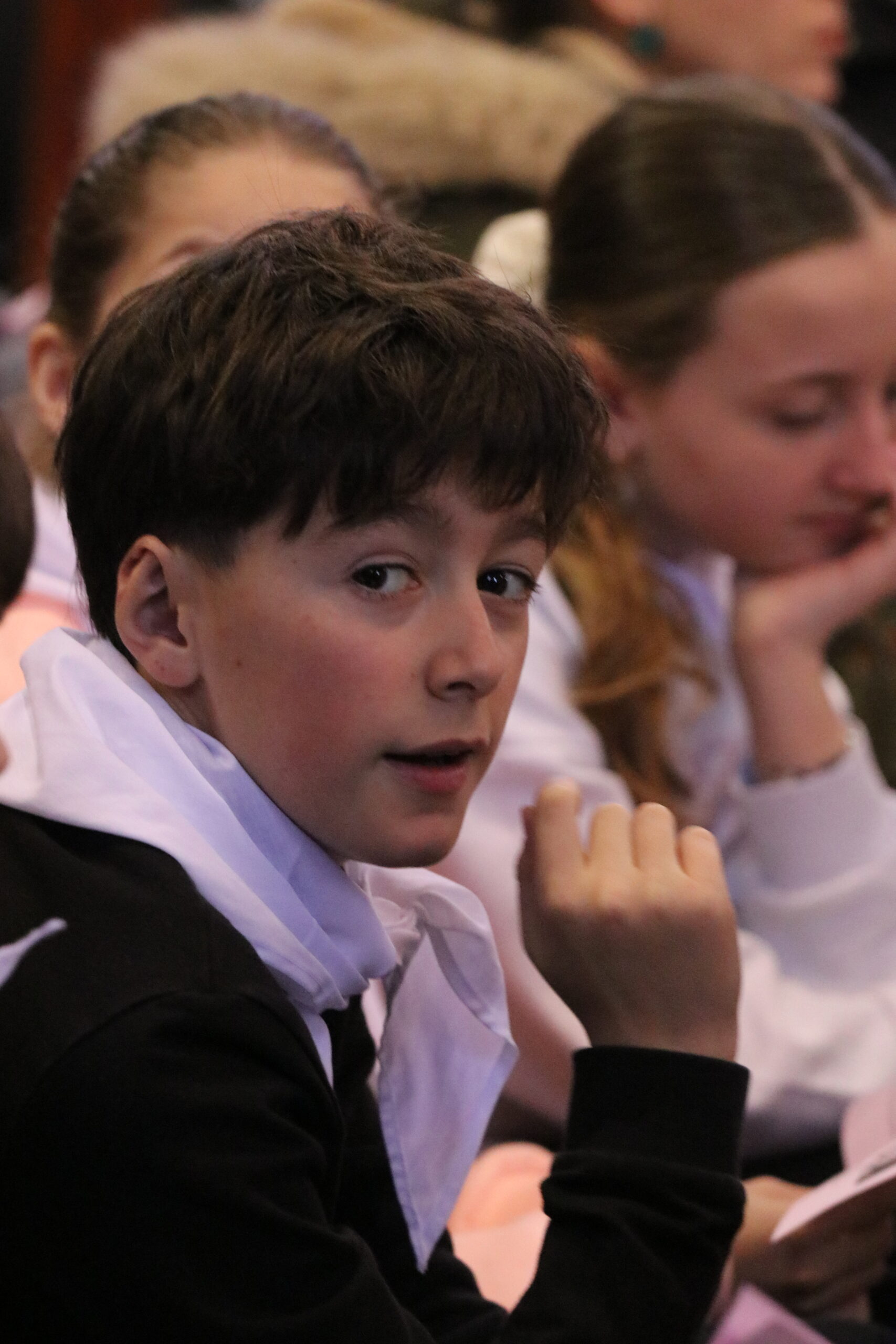 Mais toutes les bonnes choses ont une fin : nous sommes retournés en salle polyvalente pour chanter et danser avant de vivre un premier temps d’échange avec Monseigneur. Pendant 30 minutes, il a répondu à plusieurs questions sur le Credo : le Père, le Fils, le Saint-Esprit et l’Église. (Pour les questions restées sans réponse, un peu de patience : les réponses de Monseigneur Souchu seront prochainement publiées en vidéo sur notre site et nos réseaux sociaux.)