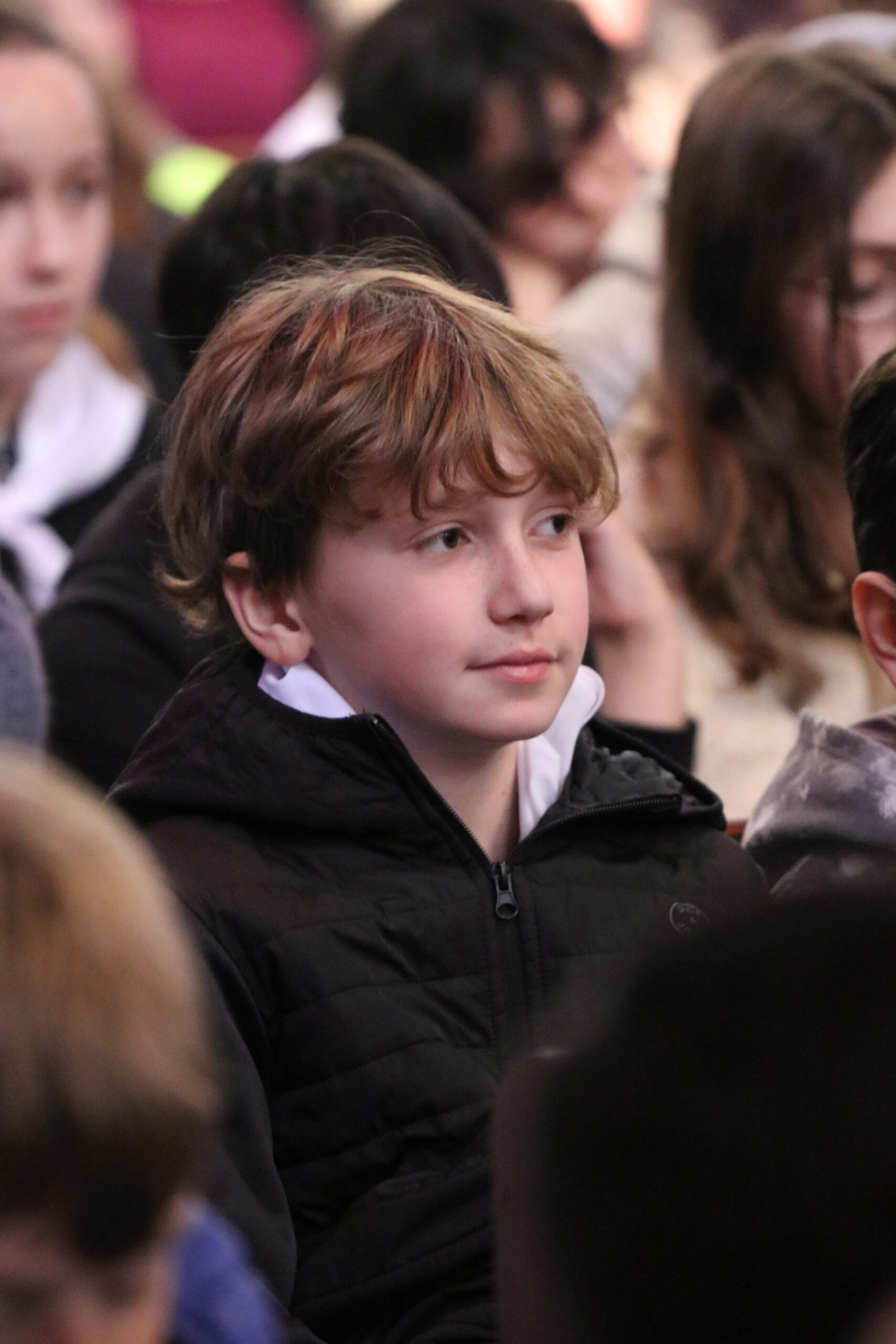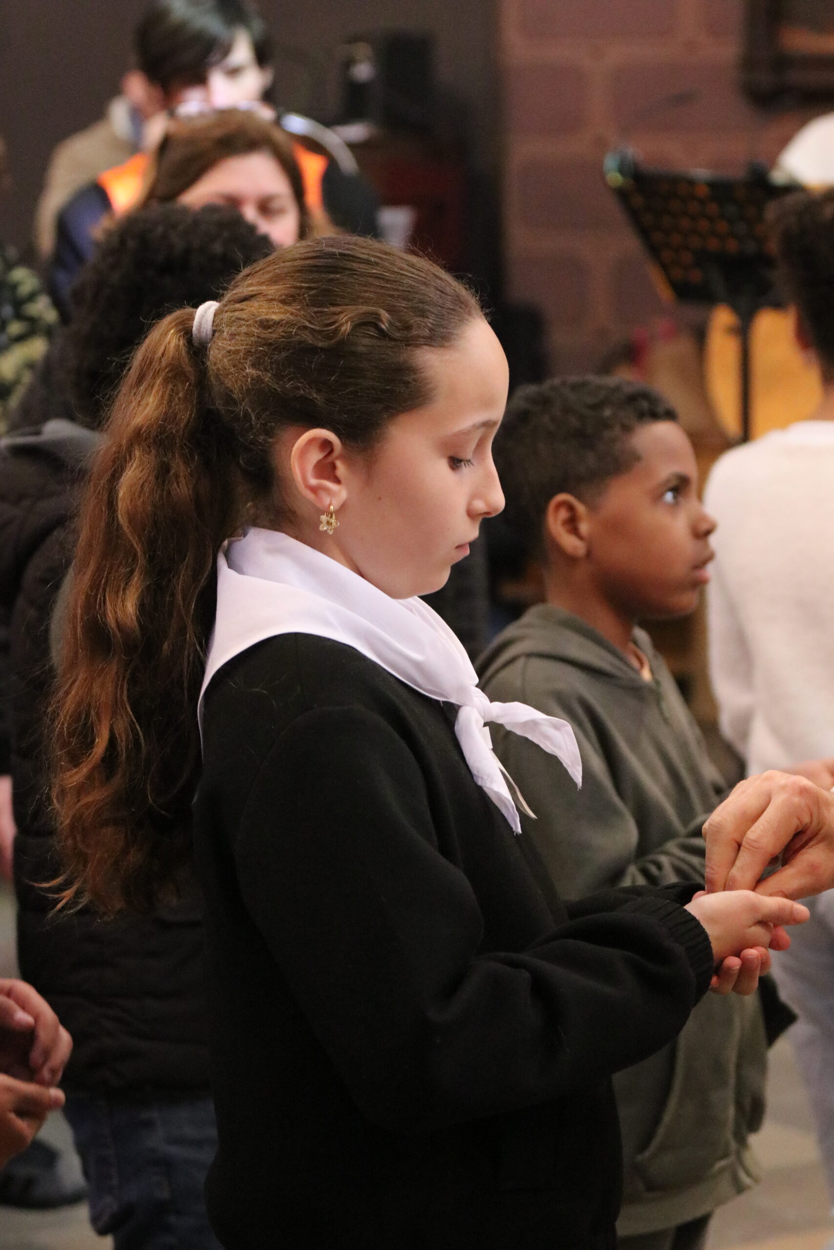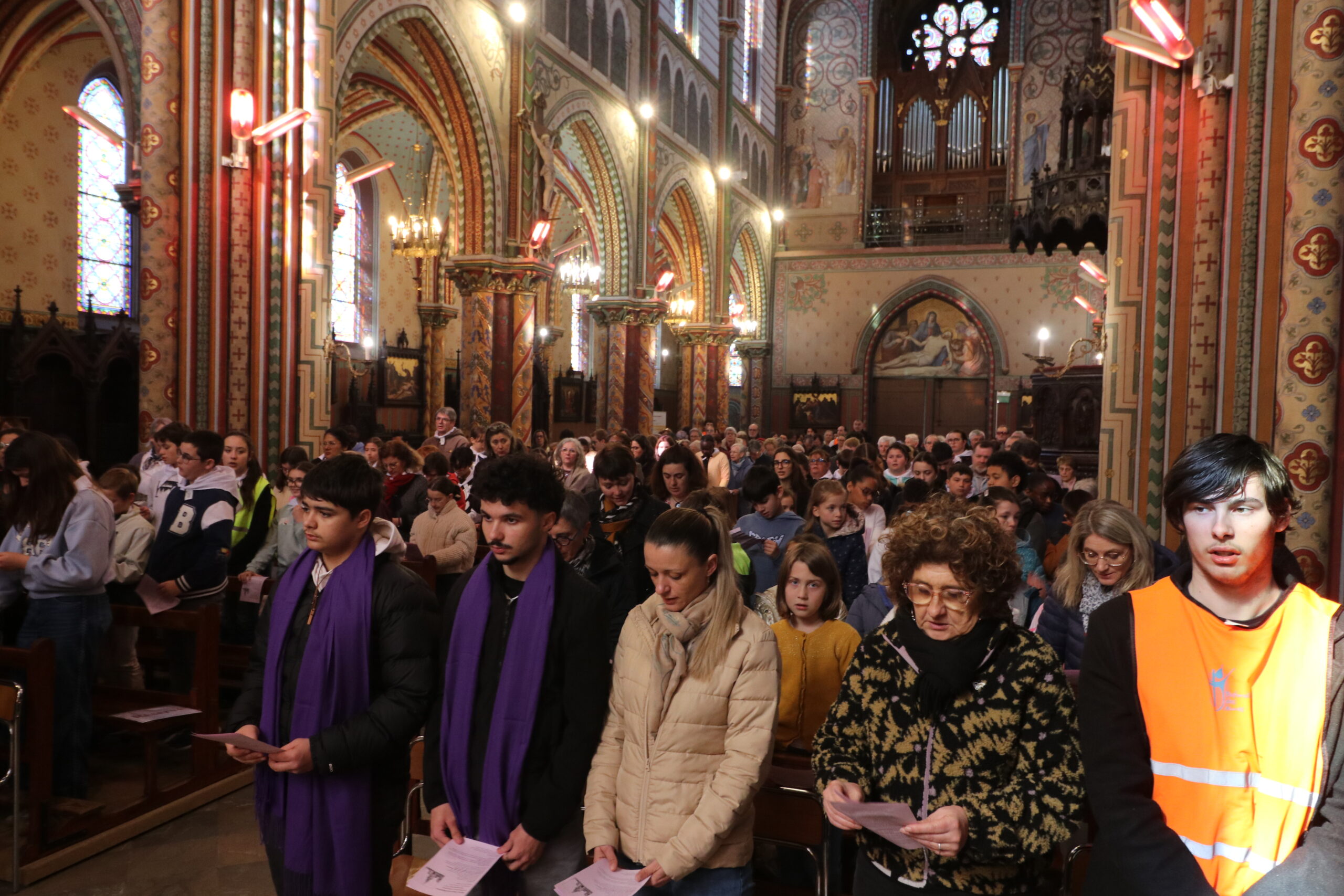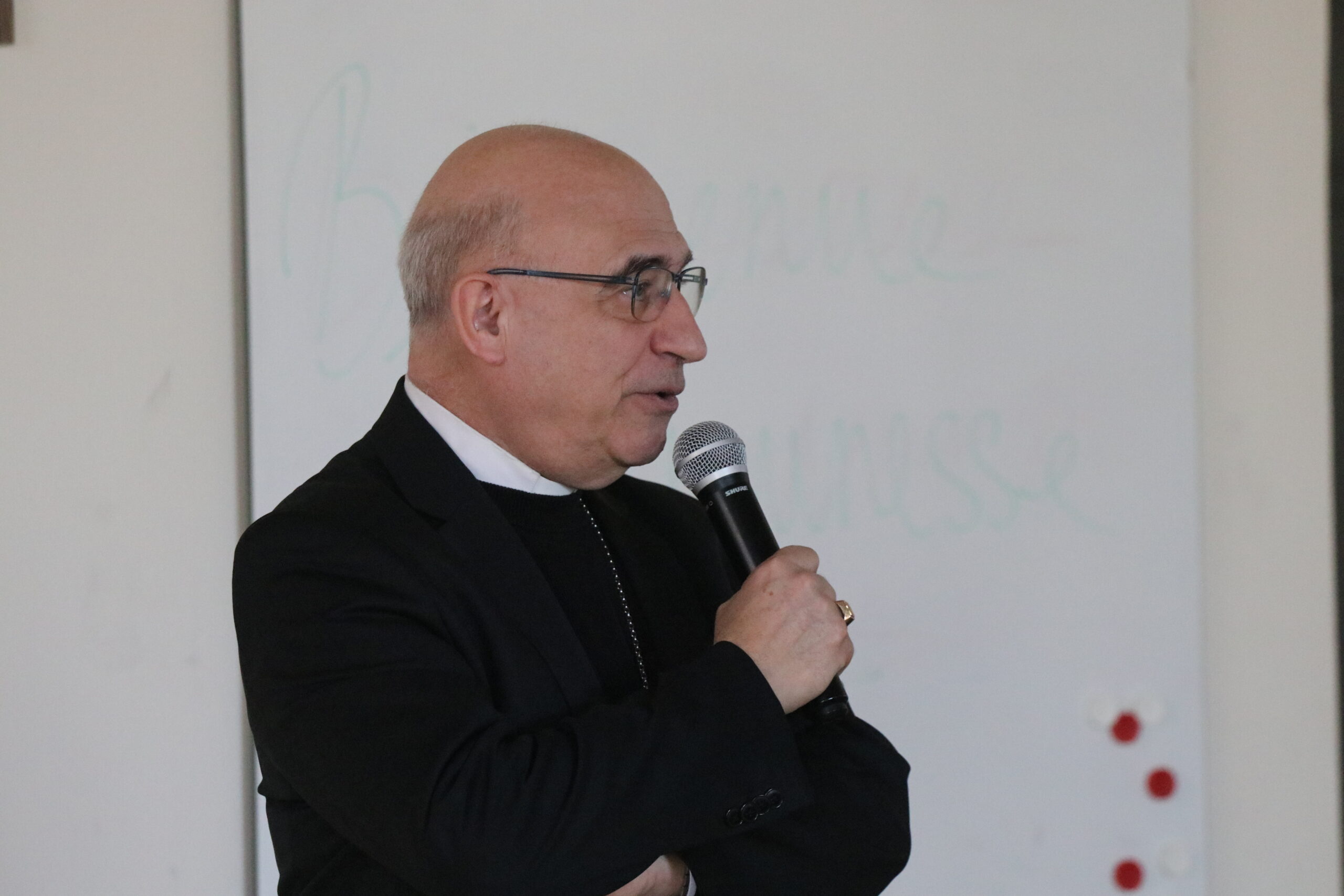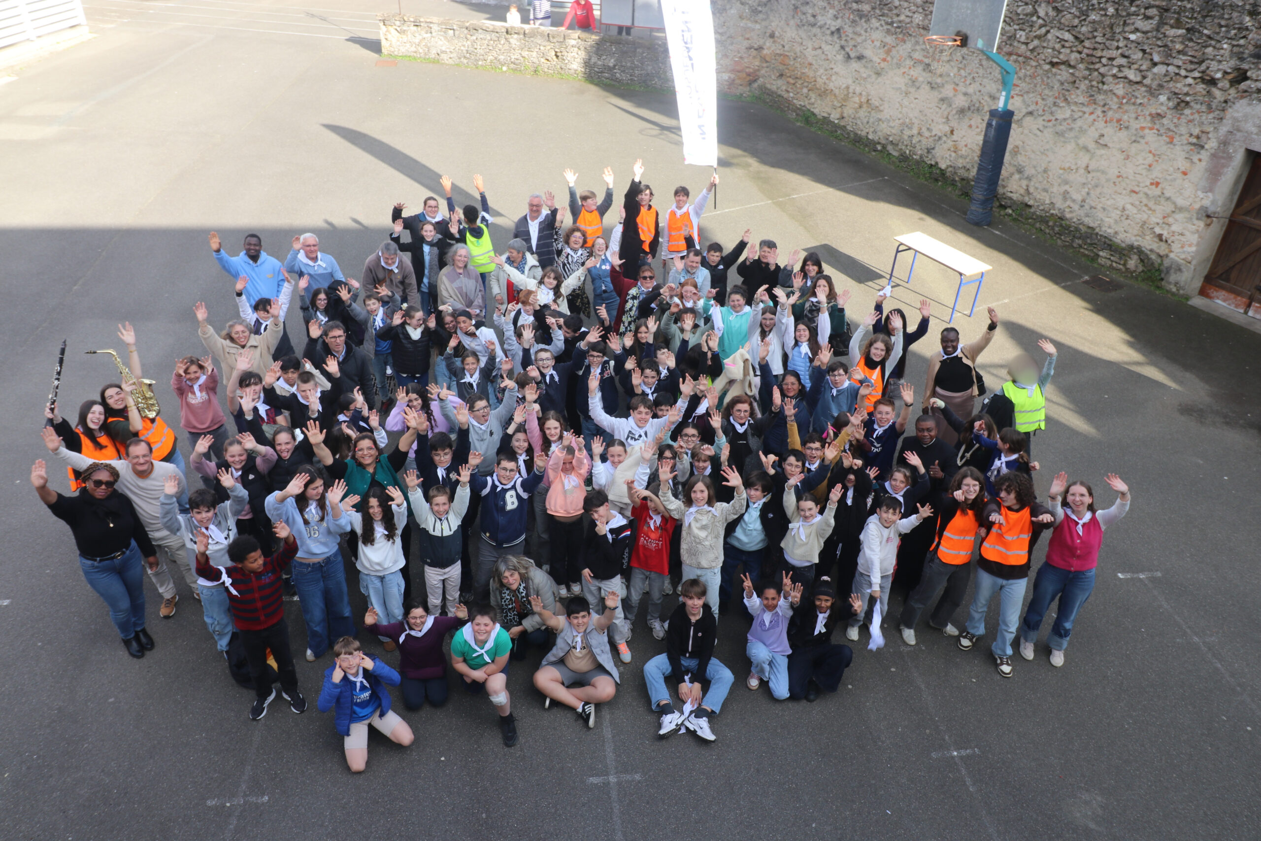 Mais toutes les bonnes choses ont une fin : nous sommes retournés en salle polyvalente pour chanter et danser avant de vivre un premier temps d’échange avec Monseigneur. Pendant 30 minutes, il a répondu à plusieurs questions sur le Credo : le Père, le Fils, le Saint-Esprit et l’Église. (Pour les questions restées sans réponse, un peu de patience : les réponses de Monseigneur Souchu seront prochainement publiées en vidéo sur notre site et nos réseaux sociaux.)